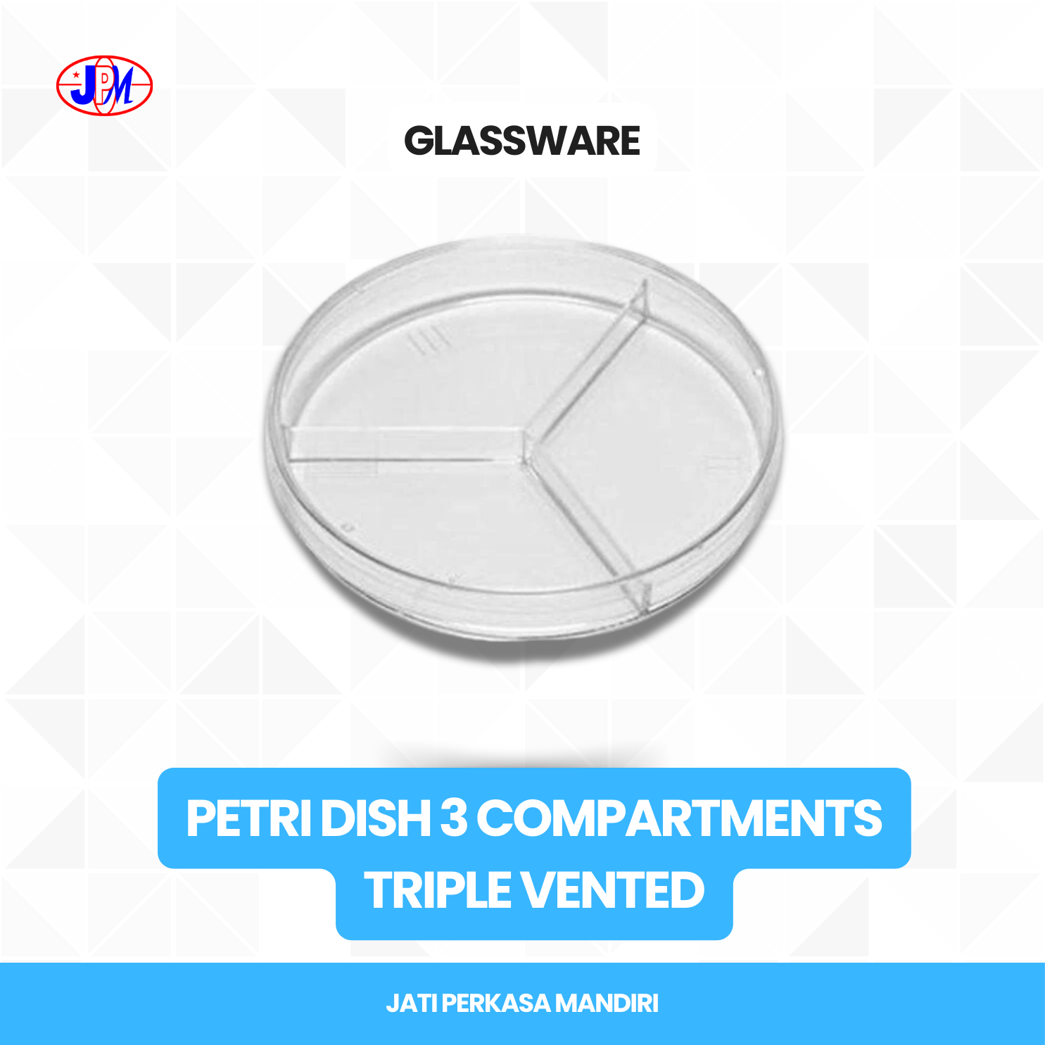 Petri Dish 3 Compartments Triple Vented 100/20 mm adalah alat laboratorium dengan tiga kompartemen yang dilengkapi ventilasi untuk mendukung sirkulasi udara dan pertumbuhan kultur mikroorganisme secara efisien. Ideal untuk eksperimen ilmiah dan penelitian. Spesifikasi :